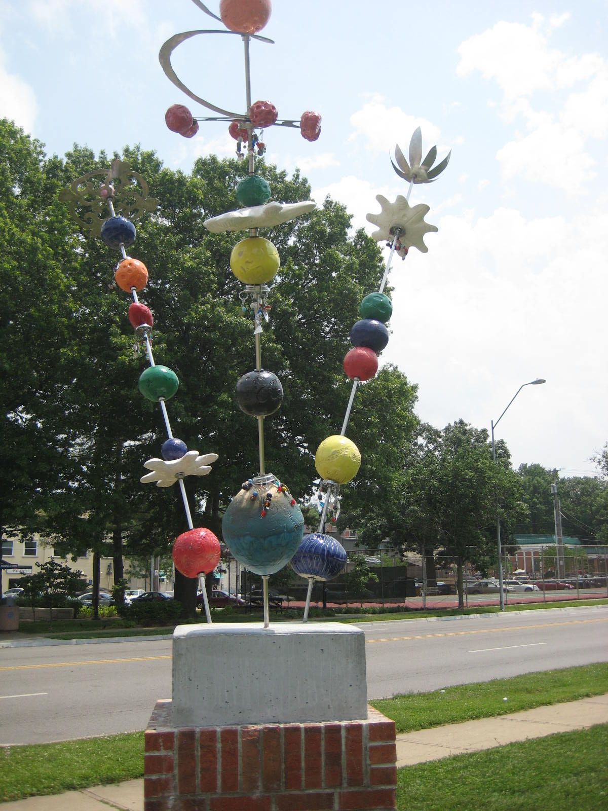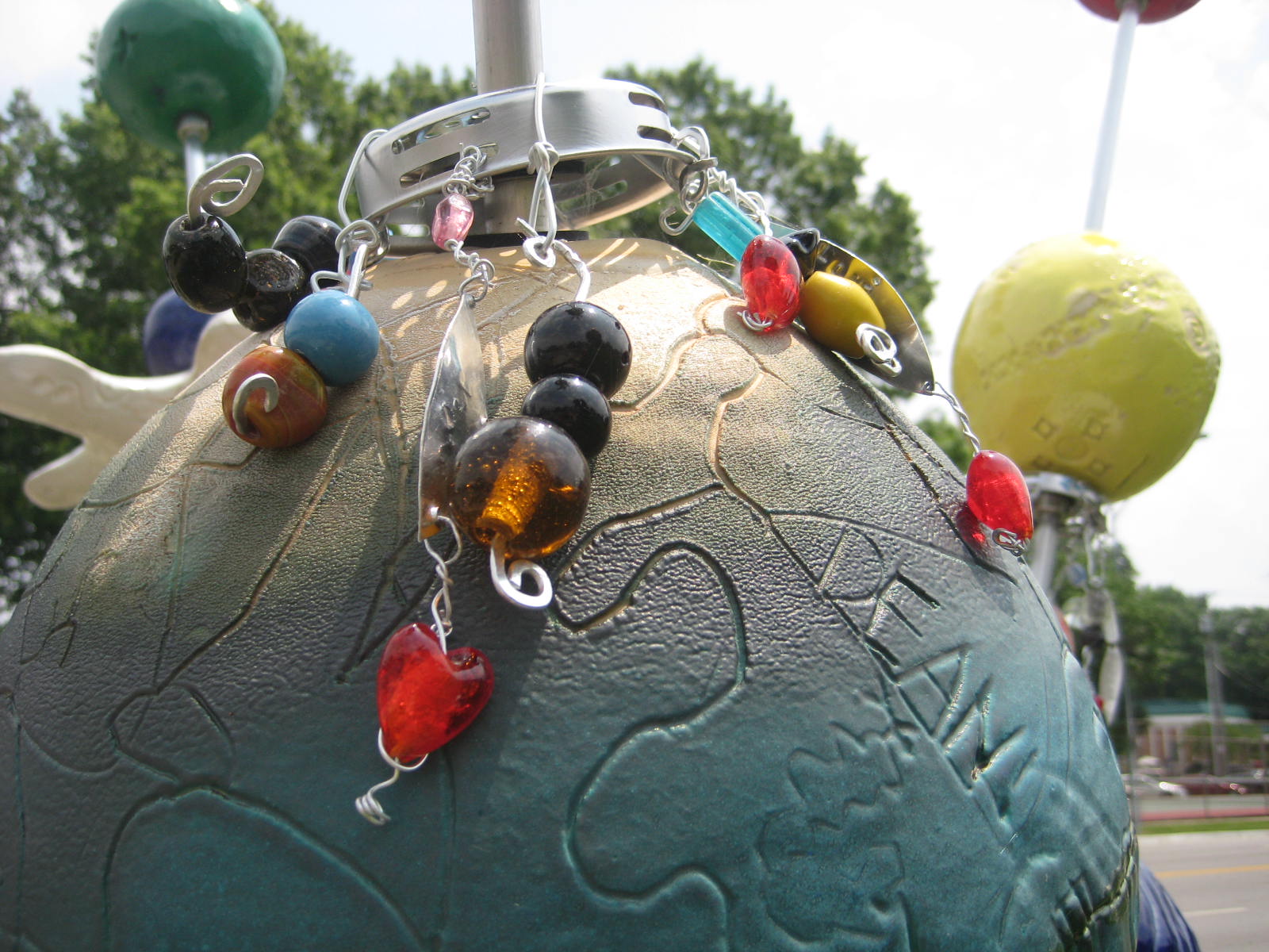 Installed in May 2010, it’s a tall and striking piece of work, made of stoneware, stainless steel and cast glass. It’s bright, colorful, adorned in parts with beads and waves a bit with the wind. This piece joins other outdoor sculptural art in Brookside, noticeably the tall metal wind catchers in front of the Roasterie and along the 63rd St shops between Wornall and Brookside Blvd.