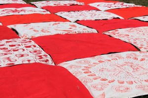 For the past several weeks, there have been several fabric painting workshops around the city. Anyone could paint a 5ftx5ft red or white canvas ‘blanket’. These individual blankets will be assembled into one huge 10,000 sf picnic blanket on the lawn Sunday from noon-2pm, and the picnic is 2-4.