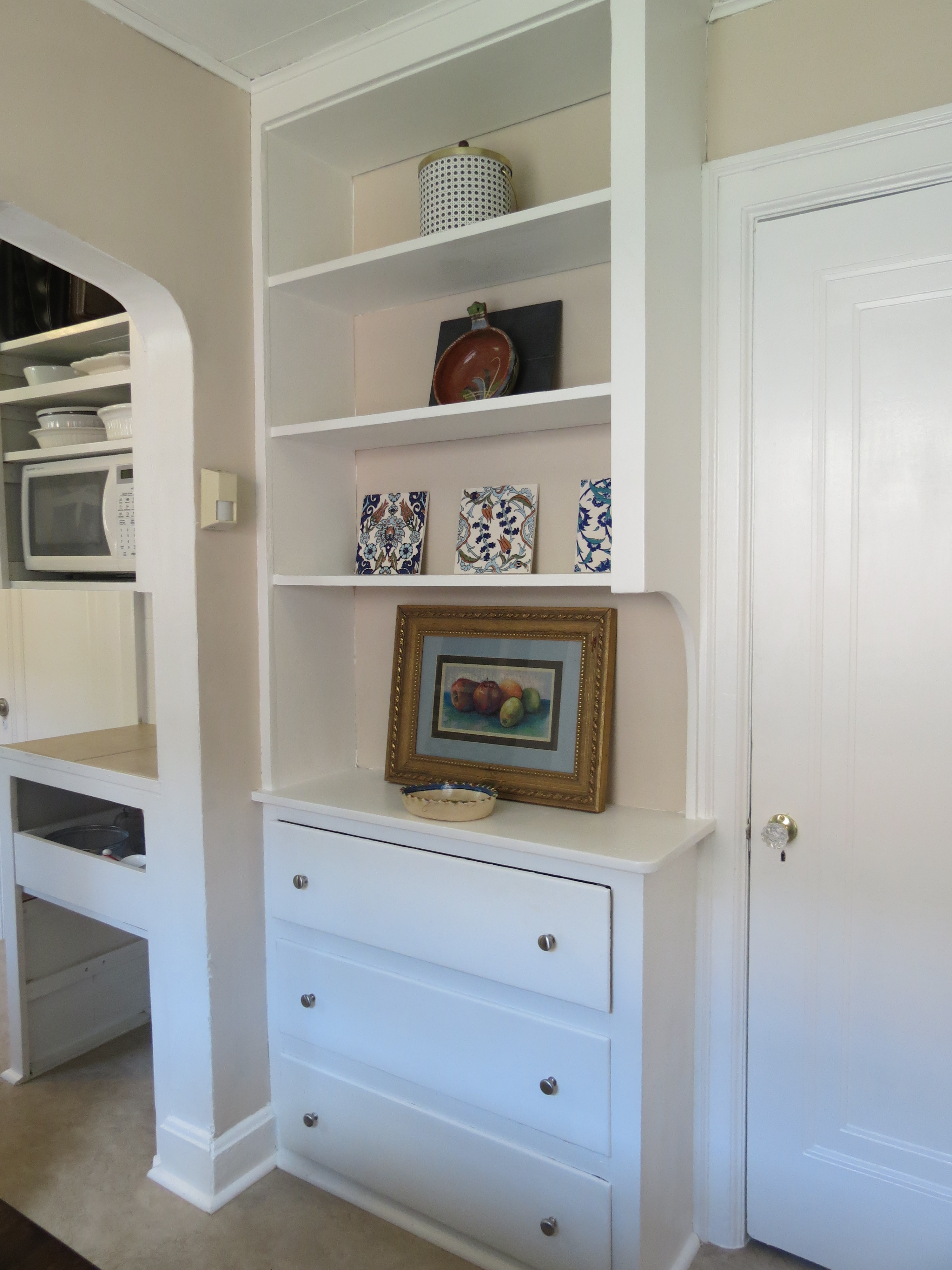 Inside, this home features two bedrooms on the first floor with a full bath, plus a living room, dining room, breakfast nook and galley kitchen. The bath and kitchen are updated, and in the kitchen you’ll find original built-ins, including a fold out spice rack–so charming! There are some original light fixtures too. Neutral wall colors throughout the home.