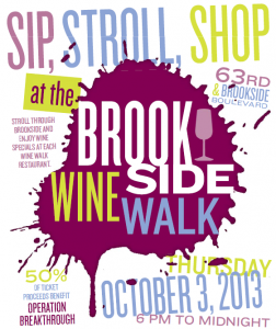 Tomorrow night (Oct 3) is the first Brookside Wine Walk, with 50% of the proceeds benefiting Operation Breakthrough.  This event is pretty self-explanatory:  buy a ticket, walk to participating restaurants, enjoy $3 glasses of wine and mingle with your neighbors!  Buy a ticket in advance for $5 or pay  $10 day of event. These locally owned businesses are hosting the walk, starting at 6pm:  Avenues Bistro, Blue Grotto, Brooksider, Carmen’s Café, Charlie Hooper’s and Michael Forbes.