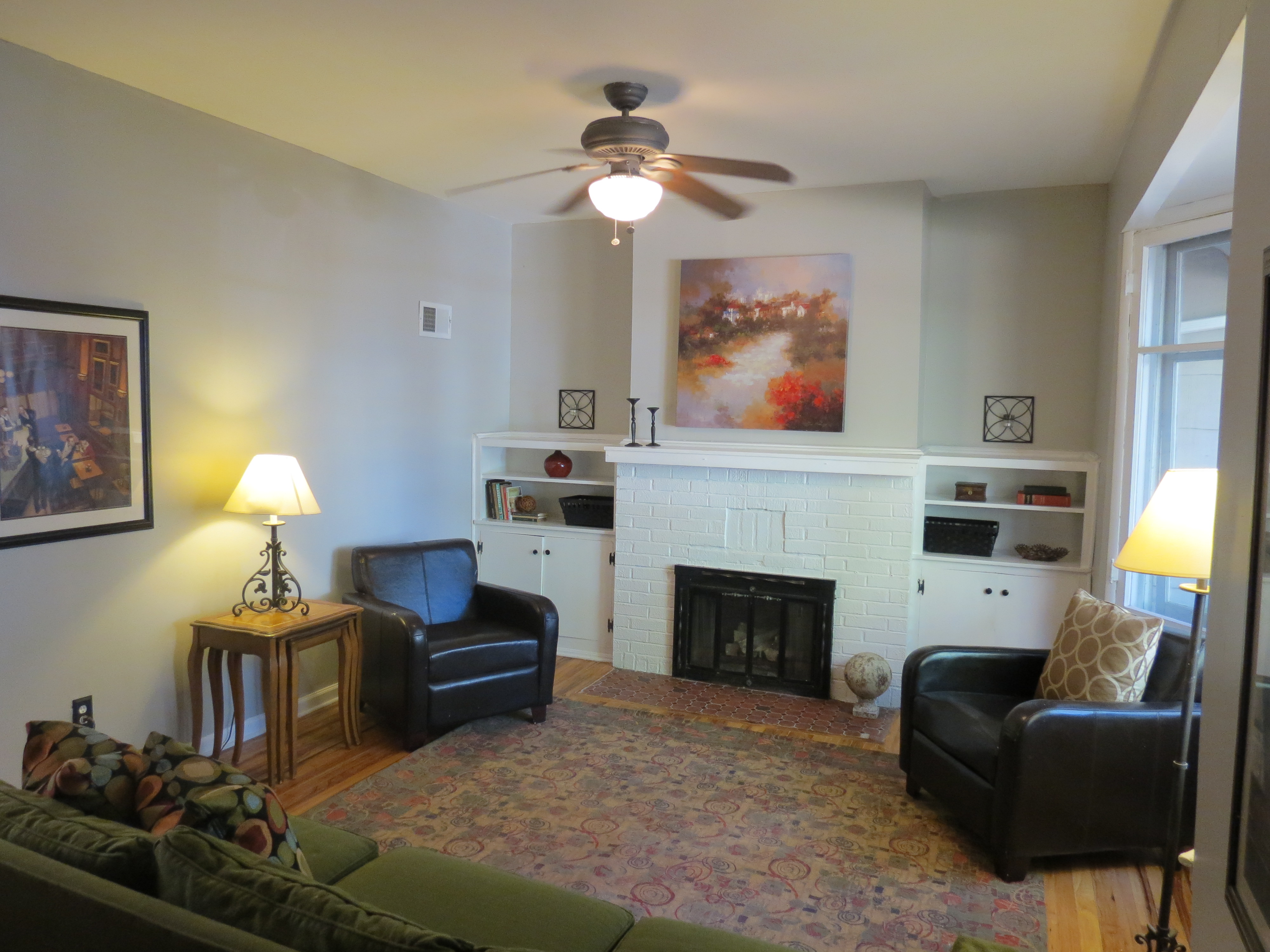 Built in 1946, the home is located in Armour Hills Gardens, between Oak and Holmes on E 66st St. There are two bedrooms on the first floor, plus a full bath and this cozy living room with built-ins on either side of the fireplace.