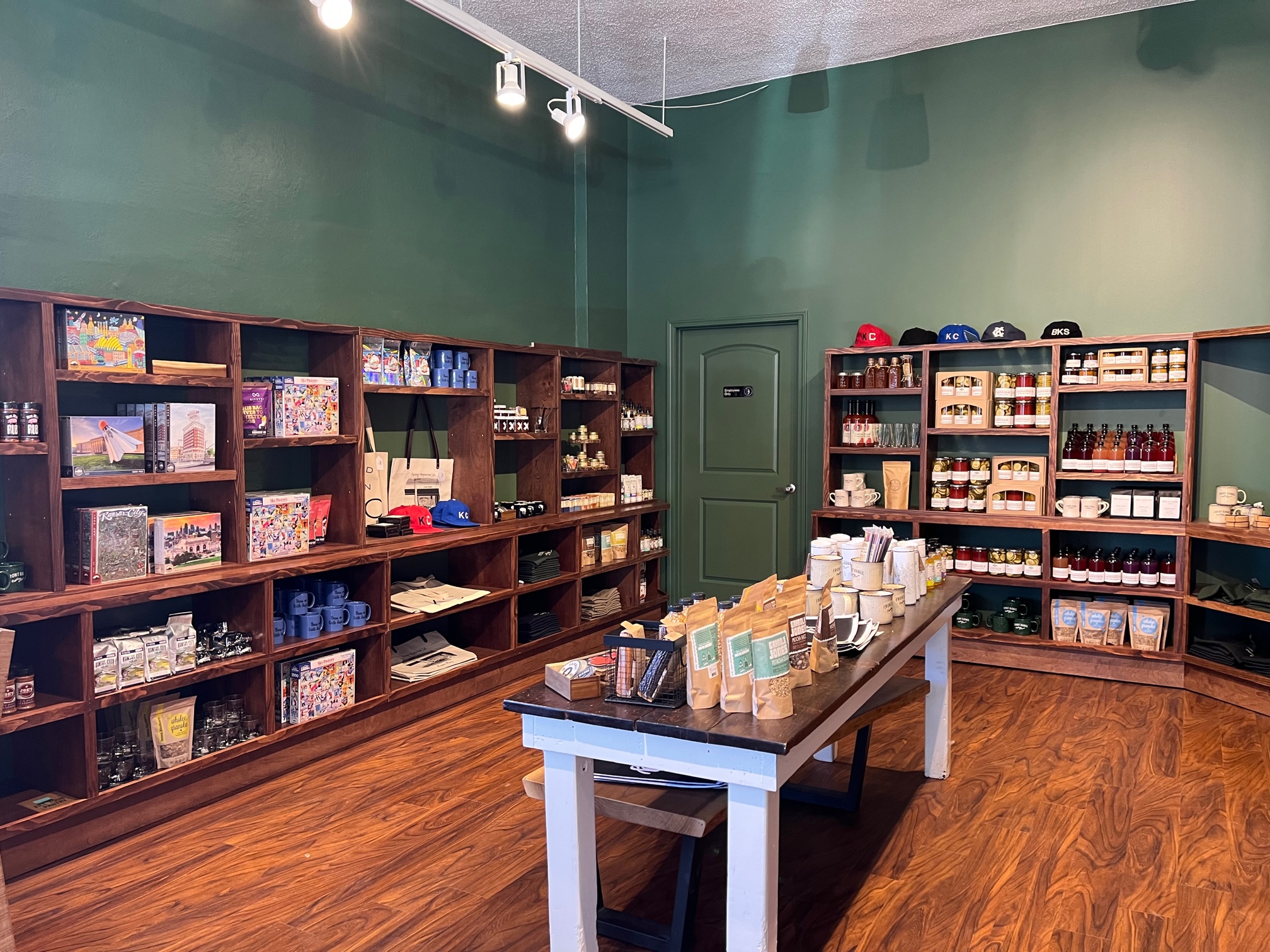 Partners Tyler Enders and Keith Bradley explained the mission of the café/store: “It’s kind of like a modern, eclectic bodega” with all kinds of specialty food items and fun stuff available to purchase. Every merchandise shelf offers something you’ll need or want: puzzles, t-shirts, candles, soaps, snacks, BBQ rubs, bags, cups and glasses…there’s over fifty different brands in this space! Tyler explained he wants to add seasonal items too, like garden tools, snow shovels and random, useful “stuff” that he thinks would be useful for area residents. (Suggestions welcome!) There’s a strong emphasis on a wide variety of local and regional products. You’ll see more than one kind of granola and coffee for sale. “There are so many people in KC who do coffee well; we will bring in different vendors and showcase them for a while, to give new businesses much needed exposure.”