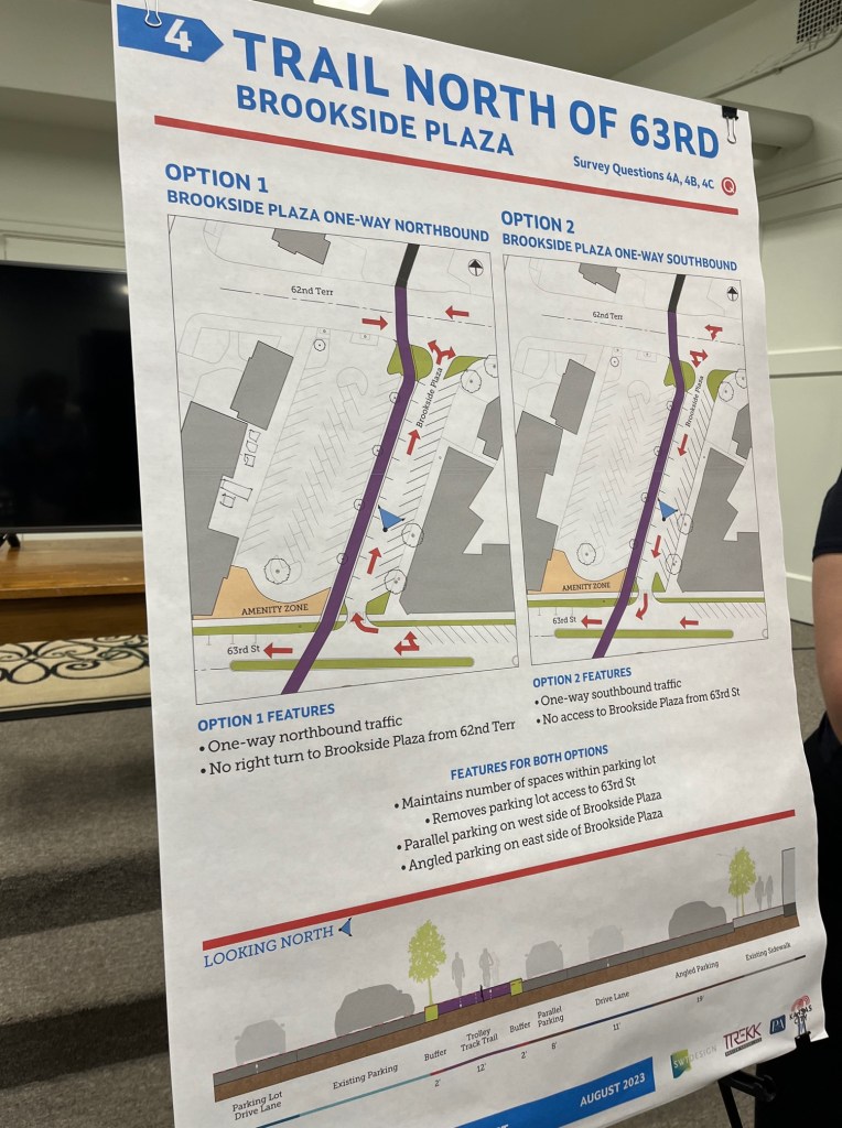 Last week there was a public open house/meeting with city representatives regarding proposed changes for the route of the Trolley Track Trail in Brookside. The goal is to continuously connect the trail between 62nd Terrace (the street that Cosentino’s is on) and Meyer Blvd. The project is part of the larger 2019 63rd St Corridor plans.