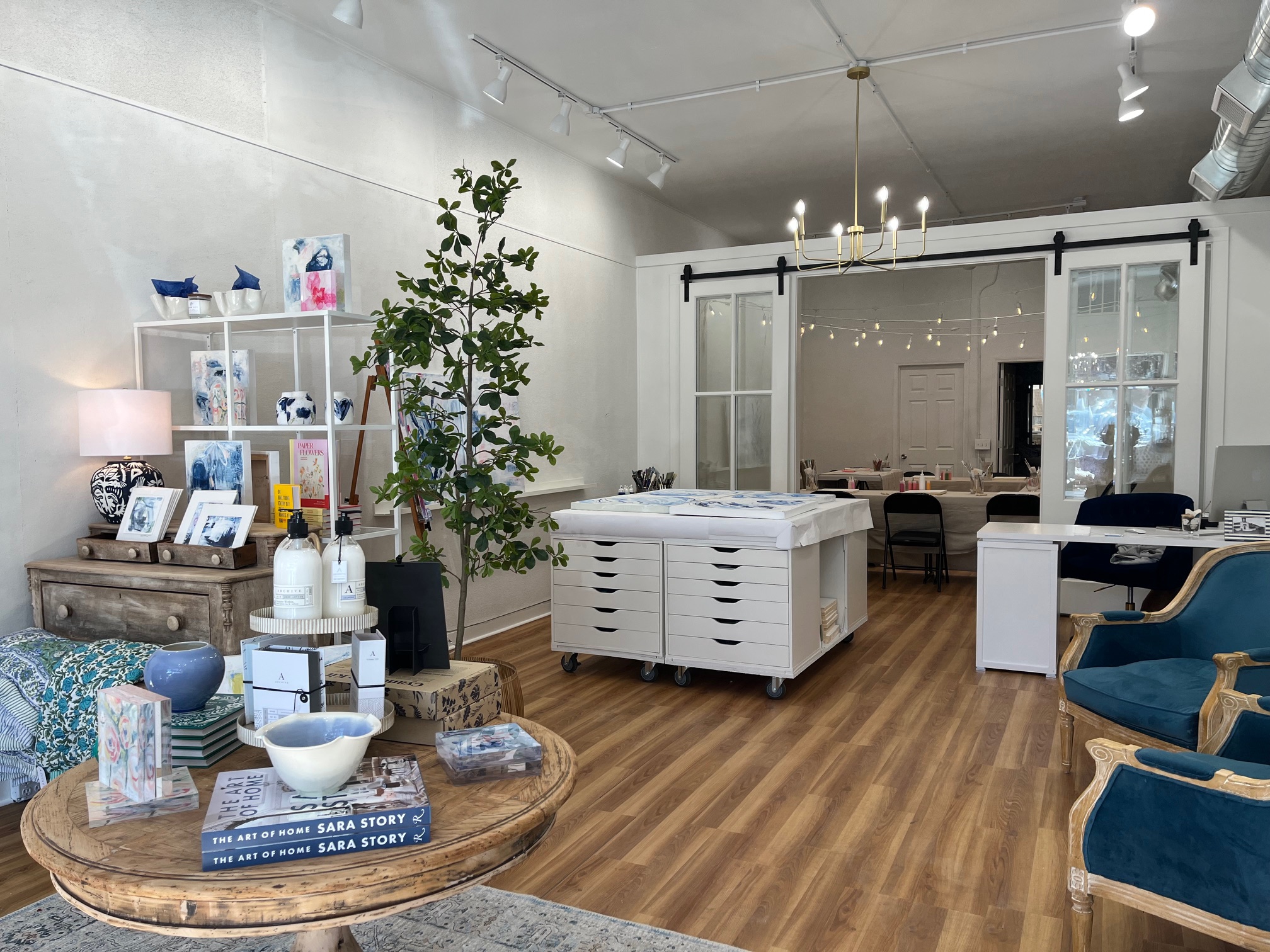 Like so many working artists, Leslie has two full time jobs: working in this space and raising a family of five children with her husband. You can email her (leslie@blueskyartandhome.com) for shop hours or pop by when you are walking in the neighborhood.