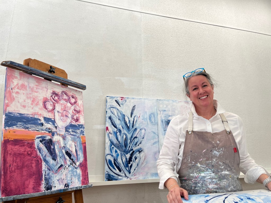 Leslie grew up in Brookside and graduated from the University of Kansas with a BA in Fine Arts. She worked out of her home for years as a graphic designer (and still does that work); after her Dad passed a few years ago she started to paint on canvas. She had pop up shows at various locations at First Fridays, and eventually wanted to have her work on display in her own space. She met up with her close friend Katherine Bramble Taylor and together they had a long collaborative “blue sky” session, talking about “what would you do if you could do anything”. They decided to look for space together in the Waldo area and found this perfect spot. Katherine’s floral and gift shop, Bramble and Stem, is next door.