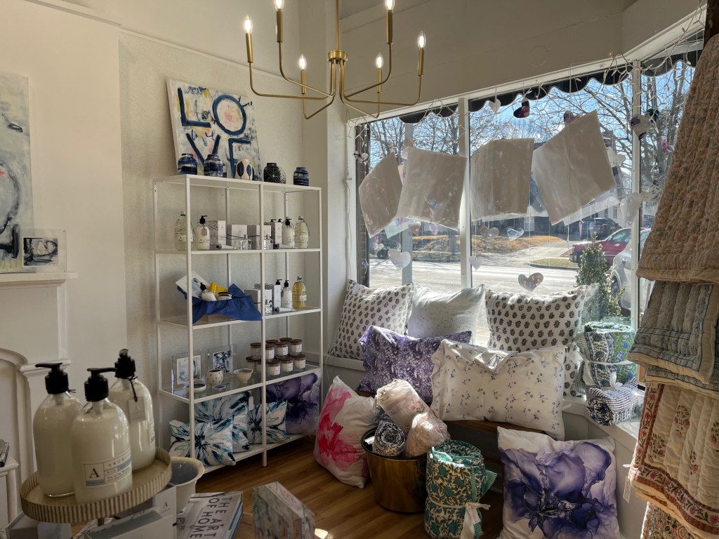 Blue Sky is an art studio, gallery and boutique. Inside you’ll find Leslie’s original paintings on the walls and unique merch for sale: pottery by Rachael Akin from Lees Summit; Archive bath and body products by Margot Elena; beautiful textiles and pillows, small vases, books and a special Blue Sky candle, scented by Brookside’s The Corner Candleshop. In the back of the store, Leslie hosts creativity workshops, often collaborating with Katherine from Bramble and Stem next door. Leslie explains these workshops are not technique or skill driven. “Each one has a theme, and we start out with some journaling thoughts for inspiration. Then everyone uses paints and various marking tools to create a personal piece of art”. No judgement here–Leslie knows everyone is born with a creative spark of some sort and she works with you to naturally bring out your inspiration in a unique way.