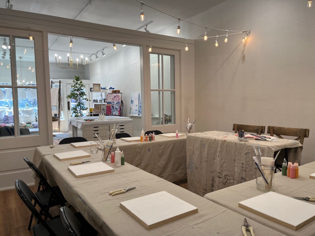 Besides creating art in this space and offering workshops and special gifts, Leslie also works on commission. Her mission is to create art with love; her work is deeply personal and meaningful. Through the commissioned pieces she will transform cherished photos into abstract paintings or create something entirely new, guided by emotions as she listens to your favorite songs via a playlist. Every piece is very personal and lasting.