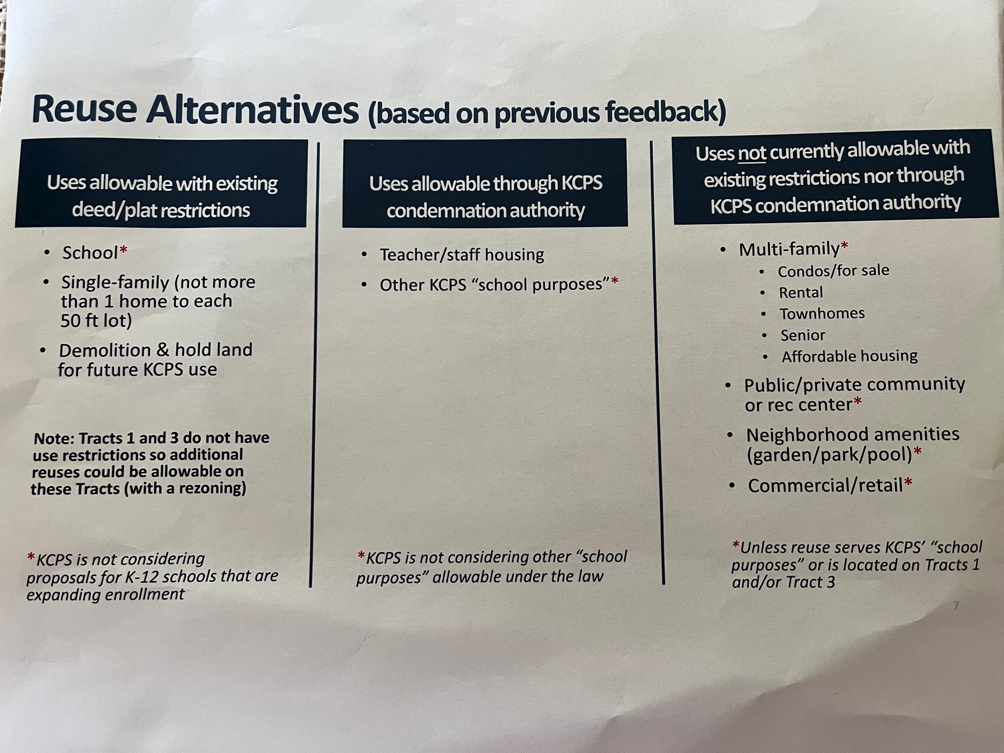 It seemed clear to me that KCPS would prefer to use this site for teacher housing; and based on current deed restrictions, the land can be only be used for a school or single family homes (see chart above). Through “condemnation authority”, teacher housing could be an option. KCPS has no plans to reopen the building as a school; nor are they considering other “school purposes” allowable such as a school library, warehouse, museum. As at the previous meeting, Shannon Jaxx (former KCPS employee, now a consultant) said about 25-45 apartments could fit on the site; rental rates would be well below market value for the teachers. It also seemed those in attendance, at least 100 persons or so, would prefer to use the land for new single family homes. Concerns expressed about the teacher housing included: the impact on nearby homes regarding traffic and home values; adding too much density to the area, and KCPS’ ability to manage and maintain the apartment building.